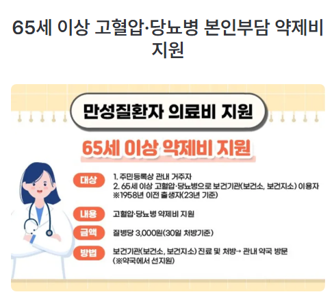셋째, 연령 조건이 붙는 경우도 있습니다. 특히 만 65세 이상 노인은 고혈압·당뇨 지원 대상에서 우선 고려됩니다.